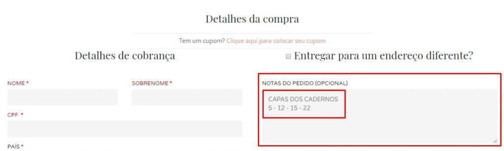 Opção 1: No fechamento do pedido em “notas do pedido” coloque os números correspondentes às capas que você quer como mostra na imagem abaixo.